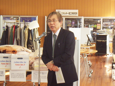 リサイクルフェア会場隣の交流会場では、自己紹介タイムが設けられ、参加者はお茶を片手に和やかな雰囲気の中、お互いの交流を深めました。また交流会コアタイムでは、宇治キャンパスにある研究所の所長も参加し、岸本泰明 エネルギー理工学研究所長の挨拶の後、青山卓史 化学研究所副所長、SANGA-NGOIE Kazadi 生存圏研究所教授を紹介しました。引き続き行われた電化製品等の抽選会で、会場は大いに盛り上がりました。