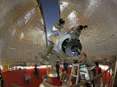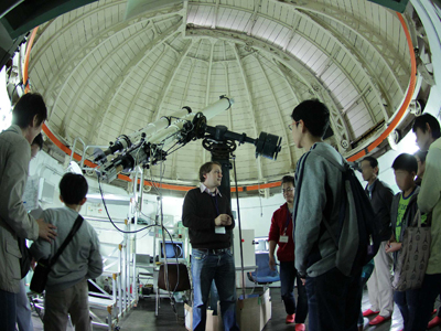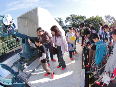 「Galleryweek2014」では宇宙をテーマとしたさまざまなアート作品を天文台に展示しました。「一般公開」では望遠鏡や観測装置の展示と解説のほか、座談会、4次元シアターなども行い、夜には45cm屈折望遠鏡を用いた観望会を行う予定でしたが、残念ながら天候に恵まれませんでした。「京都市小学校見学会」は京都市教育委員会と連携し、9校の小学校を受け入れて見学会を行いました。