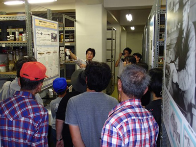 例年は、舞鶴市のイベントの中で会場を借りて実験所紹介を行っていましたが、今回は初めて実験所での実施となりました。飼育棟では、実際の研究現場を見ていただくとともに舞鶴湾の生き物に触れるコーナーなどを設け、来場者に身近な生き物を紹介しました。標本館では、リュウグウノツカイなどの稀種の展示、骨格二重染色標本の展示、プランクトンの観察コーナーを設け、また、マダイの学習実験をデモンストレーションしました。1日に3回の実験所のスタッフが説明を行いながら所内を巡る「ツアー」では、毎回概ね定員いっぱいの参加者がありました。実験所に初めて足を踏み入れた方がほとんどで、「こんなところに京都大学の施設があったのか」と言う声から、「30万点の魚類標本に圧倒された」、「ふだん体験できないことを体験できた」などの好評価を得られました。