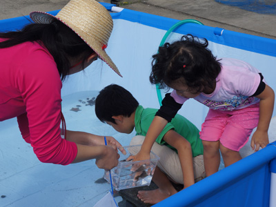 タッチプールで舞鶴湾の生き物に触れる参加者