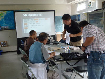 当日は、まず観測所において田辺湾湾口にある「田辺中島高潮観測塔」および観測船「海象」を用いた現地観測活動を概説した後、実際に観測船に乗って観測塔付近まで移動しました。観測塔の見学を船上から行い、観測塔から戻る途中には水温・塩分濃度の観測を体験しました。「船に乗って海水の調査を行うなどなかなかできない経験をさせていただきました。また、このような機会があれば参加したいと思っています。」等の意見が寄せられ、観測所の活動の一端を紹介できるよい機会となりました。