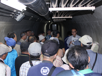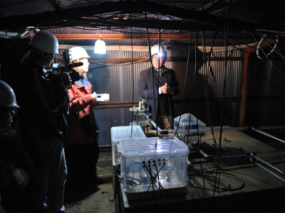 施設探検ツアー(ハルタ山観測坑道内にて計測機器の説明を聞く参加者)