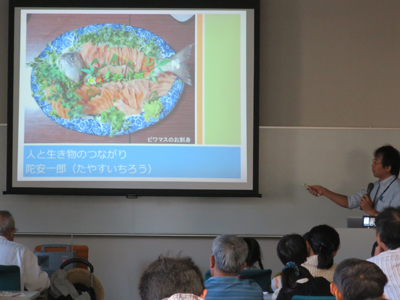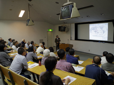 センター長より、生態学研究センターで行なわれている研究について一通り紹介した後に、教員が「だれのために花は咲く?」、「人と生き物のつながり」という2題の講演を行いました。その後に行った自由参加の「CERの森・自然観察会」にも多くの参加者がありました。今回も、小さなお子さんから年配の方まで幅広い方にご参加いただき、遠方からの参加者も見受けられました。