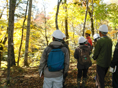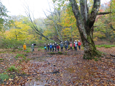 管理棟にて開会式および概要説明を行い、その後車で研究林内の遊歩道に移動し、自然観察を行いました。全体を二つのグループに分け、教員・技術職員の解説を聞きながらゆっくりと遊歩道を歩きました。今回は例年になく紅葉がきれいで、参加者からも「参加して良かった」との感想が多く寄せられました。
