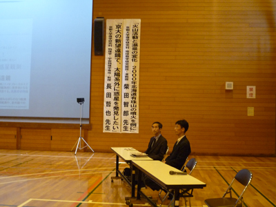 1日目は、「京大の望遠鏡で太陽系外に惑星を発見したい」、「火山活動と温泉の変化-2000年北海道有珠山の噴火を例に-」の二つの講演を行った後、火山研究センターの職員が、会場に展示したポスターでセンターの研究について説明を行いました。講演には、地元中学生170名も含め、合計250名の参加がありました。翌日の一般公開では、火山研究センターの歴史、火山研究の最前線のポスター、観測の実験などを披露しました。親子連れなど80名の参加があり、「観測の様子がよくわかって面白かった。また来年来たいと思った。」などの声が寄せられました。