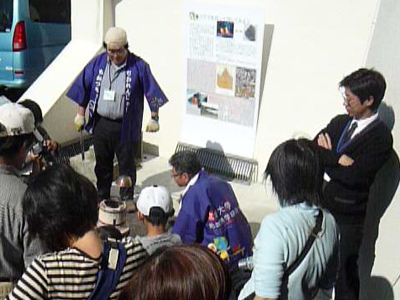 施設公開(噴火直前の地盤変動データの説明を聞く参加者)
