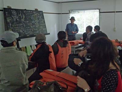 当日は、所長挨拶に続き、2題の講演を行った後、船着き場へ移動し、研究実習船ヤンチナに乗船して畠島実験地に渡航しました。実験地では、まず実験所分室黒板に描かれた紹介図を使って環境の概要を説明し、引き続き教員の案内で実地解説を行いました。後半は2班に分かれ、一班は場所を変えて実地解説を続け、体力に余裕のあるもう一班は、畠島丘陵中腹の昭和天皇臨幸記念碑を見学しました。畠島の船着き場に戻る途中、潮の高さが予想外に上昇し、膝上まで水に入らないと渡れないというハプニングもありましたが、教員・参加者が一致団結してこれを乗り越え、無事実験所に帰還しました。