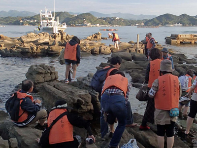 潮が上がり隣の岩に渡るため裸足になる参加者達