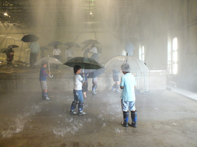 研究棟屋上での強風と雨の体験「上は風が強い」