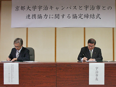 このような中、2014年4月4日に宇治キャンパスで行ったたそがれ花見コンサートに山本市長が来訪され、そこでの対話を契機に、宇治キャンパスと宇治市との連携協力を一層進展させる機運が生まれました。それ以降、両者で意見交換を重ね、本協定の締結式を迎えるに至りました。