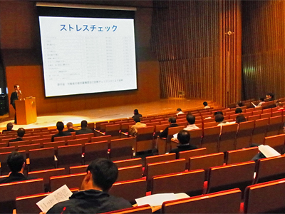 講演では、職場におけるストレスは、仕事の能率を低下させるだけでなく、うつ病や不安障害などの疾患を引き起こす場合があることや、健康で充実した職場環境の実現には、個人だけでなく、組織全体が一つになって取り組む姿勢が大切になることについての解説がありました。また、ストレスが身体に与える影響とそのメカニズム、適切な睡眠習慣、問題解決のための思考法や環境の調節などについて、対人関係ストレスを中心に、詳細に解説しました。