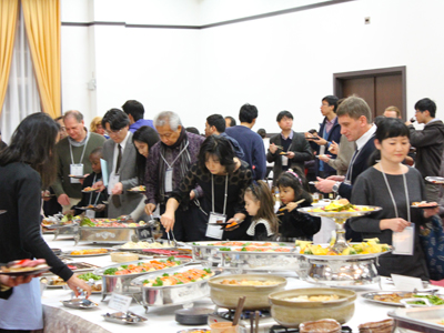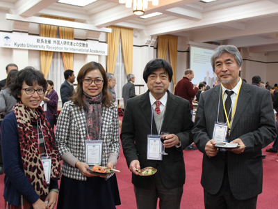 交歓会は、森純一 国際交流推進機構長の司会・進行によって始まりました。開会挨拶では、山極壽一 総長が、自身のこれまでの研究者としての歩みを紹介するとともに、交歓会がそれぞれの研究分野の垣根を越えた学際融合的な議論の場となるよう望むことなどを述べ、会場は和やかな雰囲気に包まれました。続いて稲葉カヨ 理事・副学長による乾杯の発声の後は、参加者の間で研究内容などをテーマに活発な歓談が交わされ、会場のあちこちで談笑の輪が広がりました。また、数年続けて家族で参加している外国人研究者も多くみられ、久しぶりの再会を喜ぶなど、日本滞在中の家族同士での交流の機会ともなりました。食事メニューでは、宗教や信条の多様性に配慮したベジタリアンメニューやハラルメニューなども揃い、また、会場では2013年度に続き本学の国際交流行事がスライドで流され、よりいっそう懇談を盛り上げました。