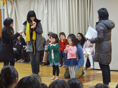 野川保育園で子どもたちとマレーシアの笛を吹く参加者たち