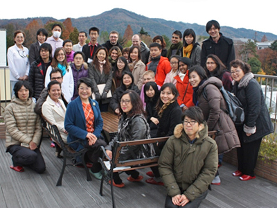 8日には、フィールドワークとして市内の「高野川保育園」と日本いのちの花教会が運営する有料老人ホーム「北白川の花の家」を見学し、子どもたちや高齢者と交流体験をもちました。「高野川保育園」では、自由でのびのびした保育を行っているにも拘わらず、組織立った行動もできることに感心したという感想がありました。「北白川の花の家」では認知症もある入居者と海外からの参加者とのコミュニケーションがおおいに盛り上がり、職員の皆さんも驚かれたほどでした。