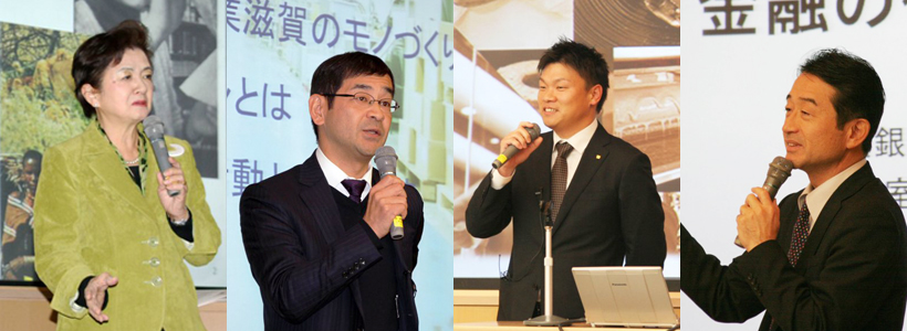 (左から)嘉田前知事の基調講演、前田代表取締役社長の講演、讃岐園長の講演、辰巳室長の講演