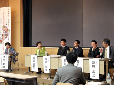 次に、森里海連環学からみる淡海の企業の挑戦と題して、「環境ガバナンス・地域振興」(吉積巳貴 森里海連環学教育ユニット特定准教授)、「企業活動と環境」(吉野彰 地球環境学堂准教授)、「森林・里山環境」(柴田昌三 地球環境学堂教授)の各視点から3企業の取り組みについて解説を行い、清水夏樹 森里海連環学教育ユニット特定准教授のコーディネートでパネルディスカッション「森里海連環を通じた「ものづくり」「ひとづくり」「地域づくり」」を行いました。パネルディスカッションでは、滋賀県では琵琶湖を抱えることに加えて宗教的要素などの文化背景が地域や人のつながりを支えていること、企業の環境に対する取り組みを継続させるために必要なこと、地域とのネットワークの作り方などについて意見が交わされました。嘉田前知事からは、研究者や学者は政治に背を向けないでほしいという願いと女性の社会進出と感性への期待が述べられました。