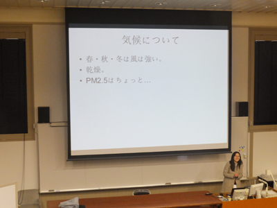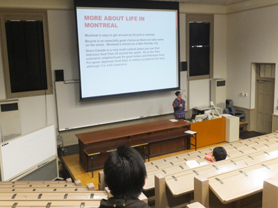 初日のコンコルディア大学に始まり、2日目は清華大学、そして最終日はエジンバラ大学の紹介を行いました。各大学間学生交流協定校から本学に来ている交換留学生が、大学の特色や宿舎・学内施設、生活状況や所在地の周辺情報など、さまざまな角度から協定校を紹介しました。参加者は講演者の話を熱心に聞き入り、中には、積極的に質問をしたり、アドバイスを求めたりする姿が見られました。それぞれに派遣留学への応募を見据えて現地での留学生活を思い描いているようでした。