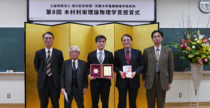 湯川記念財団・木村利栄理論物理学賞の第8回授賞式が基礎物理学研究所湯川記念館パナソニック国際交流ホールにて行われました。式では、受賞者の石橋明浩 近畿大学理工学部理学科准教授に湯川記念財団理事長から賞状とメダル、副賞の賞金が贈られ、式の後には「高次元の一般相対論とブラックホール」と題して、代表講演者として石橋准教授の記念講演が行われました。