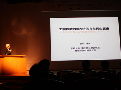 続いて岩田博夫 再生医科学研究所長・教授が、「工学段階の開発を迎えた再生医療-しなやかほっこり社会の実現に向けて-」と題して基調講演を行い、平尾一之 工学研究科教授が「リサイクル固体水素源による医療用燃料電池材料」、阪本卓也 情報学研究科助教が「超広帯域レーダーによる遠隔バイタルモニタ技術」、森本一成 京都工芸繊維大学工芸科学研究科教授が「自発光式点字ブロックを用いたロービジョン者の安心夜間歩行支援」、松田文彦 医学研究科附属ゲノム医学センター教授が「ITクラウド基盤を活用したしなやかな未来型健康増進プログラム」、中尾恵 情報学研究科准教授が「三次元画像に基づく手術プロセスの半自動計画と時系列分析」、山内敏明 パナソニック株式会社モノづくり本部チームリーダーが「ロボット技術を駆使した創薬サポートシステムの研究開発」と題して、それぞれ講演を行いました。