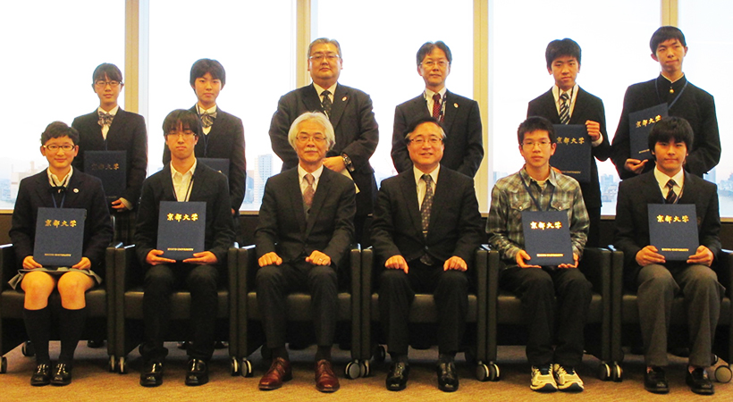 この表彰式は、2014年11月7日に開催された東京都教育委員会との連携協定に基づく高大連携事業「京都大学高校生フォーラム in Tokyo」における、平尾一之 工学研究科教授・ナノテクノロジーハブ拠点長による「自然に学ぶナノテクノロジー -蛍の光を模倣した水素燃料電池によるLED発光-」と題した講演に対する優れた感想文を表彰するもので、64点の応募があり、厳正な審査の結果、最優秀賞1名、優秀賞3名、佳作5名を決定しました。