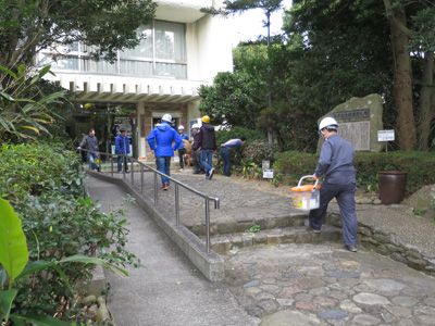 同実験所は海抜が低く、地震に伴って発生する大津波の被害を受けることが危惧されています。そこで、実験所構成員や実験所利用者、併設されている水族館の入館者が津波による被害を受けないためには、いち早く隣接している番所山の山頂(約31m)にある南方熊楠記念館まで急な坂道を伝って避難する必要があります。