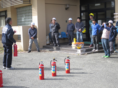 今回の訓練では一昨年度実施した訓練内容をもとに、同実験所の教職員で編成された自衛消防隊、学生など約20名が参加し、連絡班、避難誘導班、搬出班、それぞれに与えられた役割を懸命に実践しました。また、避難訓練終了後に、白浜町消防本部予防係より、訓練用消火器を使った初期消火活動の指導と訓練全体の講評を受けました。