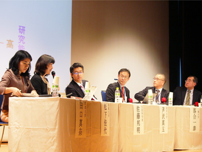 初日に開催された「大学教育の国際化・正課正課外における主体的な学び」と題したシンポジウムでは、山極壽一 総長の挨拶に続き、佐藤邦明 文部科学省高等教育局高等教育企画課国際企画専門官より基調講演、芦沢真五 東洋大学国際地域学部教授、落合一泰 一橋大学社会学研究科教授、飯吉透 高等教育研究開発推進センター長から報告があり、最後に講演者全員によるディスカッションを行いました。その後、会場の参加者を含めた活発な意見交換も行われ、10年以上にわたる高等教育研究開発推進センターの大学教育に関わる取り組みの展開と今後の課題を紹介しました。