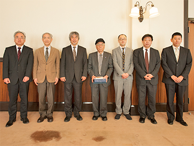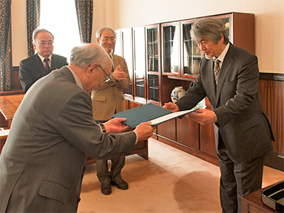 1970年から45年間にわたって百周年時計台記念館の塔時計および鐘の点検・補修業務を行い、今年度引退した杉谷鉄夫 杉谷ムセン社長に山極壽一 総長が感謝状を贈呈しました。