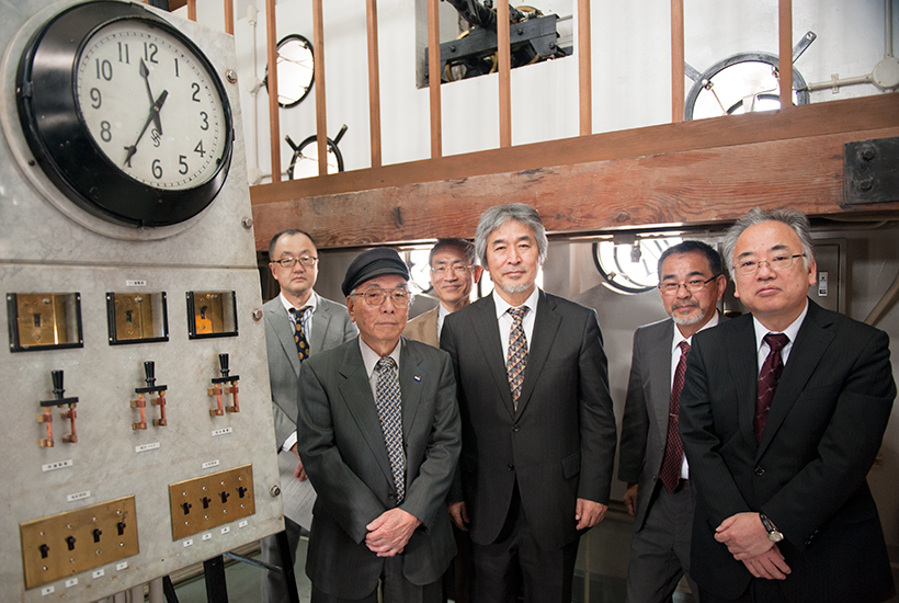 杉谷さんの案内で塔時計を見学する山極総長、佐藤直樹 理事・副学長、山下隆幸 施設部長等関係者