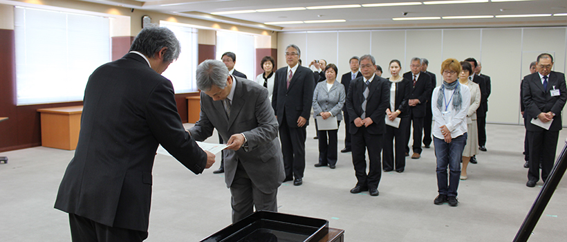 退職者功労表彰式は、退職時において勤続年数が30年以上の教職員および有期雇用教職員に対し、その永年にわたる功労を讃えるため、2012年度から創設されたもので、2014年度末の被表彰者は37名でした。