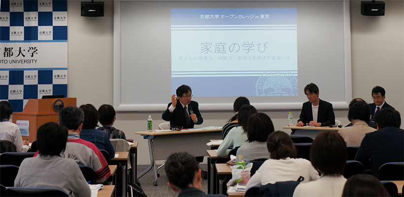 まず、溝上慎一 高等教育研究開発推進センター教授が、「子どものアクティブラーニングを支える家庭の教育・役割」と題し、豊富な実例を示しながらアクティブラーニングに関する講演を行いました。続いて、齊藤智 教育学研究科准教授が、「ワーキングメモリ理論から学びの基盤を考える」と題し、記憶のメカニズムと記憶が学びに与える影響について講演を行いました。最後に、高見茂 理事補・教育学研究科教授がコーディネーターとなり、溝上教授と齊藤准教授の講演の総括と、参加者との意見交換を行いました。