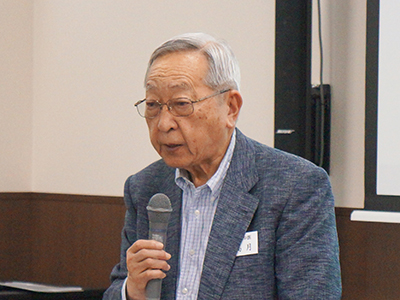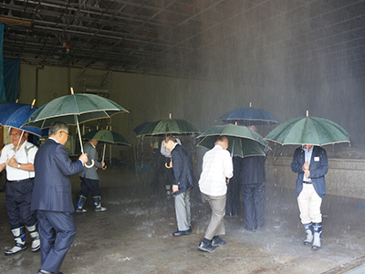 今年の5月見学例会には約60名の参加があり、山中祥光 運営委員長(経済学部・1959年卒)の司会により進められ、高月清 会長(医学部・1954年卒)の挨拶に続いて、中川一 防災研究所附属流域災害研究センター長による「淀川の特性と治水」と題した講演が行われました。この後、一同は2班に分かれて土石流、津波実験、降雨流出、流水階段歩行、浸水ドア開閉などさまざまな実験施設を見学しました。水災害や土砂災害が発生すると、どのような現象が起き、また、その場に出くわした際にはどのような行動をとればよいのか実験をとおして実際に体験しながら見識を広めました。