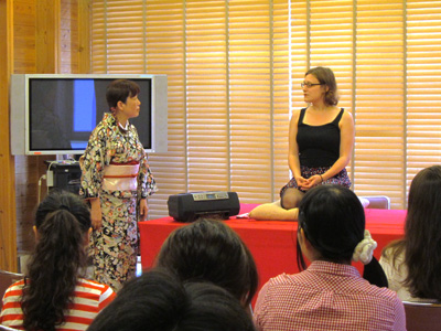 関西で活躍されている女性落語家の小夜姫さんに、「宿屋仇」という演目をパワフルに英語で演じていただきました。参加者から笑い声が起き、落語を楽しんでいる様子でした。演目の後は、参加者が小咄を練習し高座に上がって披露するなど、盛りだくさんの内容でした。