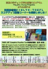 ジョン万プログラム学生派遣支援制度の一環として、附属図書館3階のメディアコモンズに、IELTS・TOEFL関連のさまざまな書籍を設置しました。英語力向上・試験のスコアアップにご利用ください。