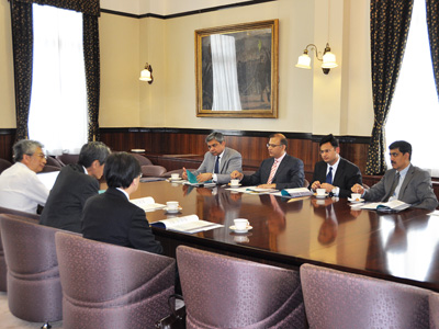 講演に先立ち、百周年時計台記念館迎賓室にて、Sinha財務大臣、インド大使館・総領事館関係者と河野広隆 経営管理研究部長・教育部長、原良憲 同副研究部長、小林潔司 経営研究センター長が本学とインドの大学間協力について話しあい、有意義な交流の場となりました。