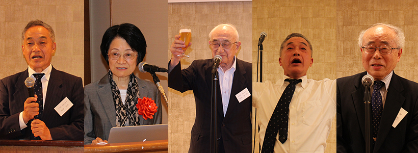 左から、開会の挨拶を行う田中会長、講演を行う稲葉理事・副学長、乾杯の発声を行う村井氏、エールを送る田中会長、閉会の挨拶を行う大家氏