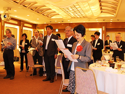 続いての懇親会では、村井研一郎 氏(医学部・1953年卒)の乾杯の発声により開宴となり、和やかな雰囲気の中、各テーブルごとに自己紹介が行われ、会員相互の交流で大いに盛り上がりました。その後、「逍遙の歌(「紅もゆる」)」と「琵琶湖周航の歌」を全員で合唱し、田中会長の演舞により京都大学へのエールが送られ、最後に大家寛 氏(工学部・1959年卒)の挨拶により、盛況のうちに閉会となりました。