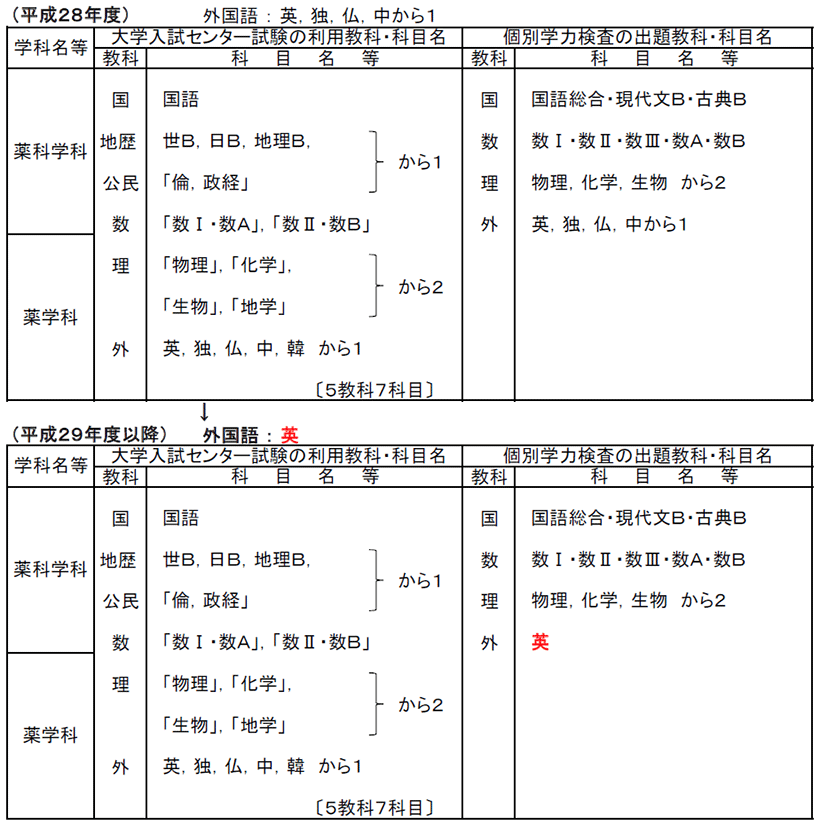 ターゲット 受験生の方 公開日 2015年07月01日 本学では、平成29年度以降の薬学部の入学者選抜方法を変更します。詳細は以下のとおりです。 薬学部における個別学力検査の外国語の出題教科・科目について 平成29年度京都大学入学者選抜(薬学部)における教科・科目の変更について(PDF) 問い合わせ先 薬学部 Tel: 075-753-4514