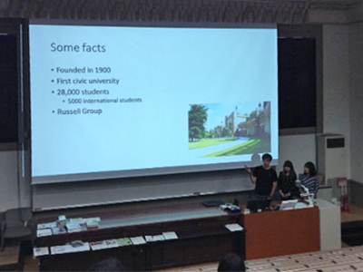 初回のインドネシア大学(インドネシア)に始まり、2回目は南開大学(中国)、そして最終回はバーミンガム大学(英国)の紹介を行いました。各大学間学生交流協定校から本学に受け入れている交換留学生が、各大学の特色や宿舎・学内施設、そして生活状況や所在地の周辺情報などさまざまな角度から協定校を紹介しました。