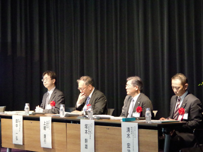 休憩を挟んだ後に行われた第2部では、3人の講演者に加えて、アメーバ経営のコンサルタントとして多くの実績を持つ清水宏治 氏がパネリストとして参加しました。また澤邉紀生 経営管理研究部・経営管理教育部教授の司会により「アメーバ経営とフィロソフィが生み出すダイナミズム」と題したパネルディスカッションを行いました。パネルディスカッションでは、「アメーバ経営と経営理念が両輪となることで生み出されるダイナミズムについて」、「企業経営にフィロソフィが必要とされるのはなぜか?」「アメーバ経営におけるフィロソフィの浸透」「アメーバ経営なくして京セラフィロソフィは実現できるか?」「21世紀の経済社会においてフィロソフィとアメーバ経営を両輪とする企業経営の意義はどこにあるか?」といった論点について活発に意見が交わされました。