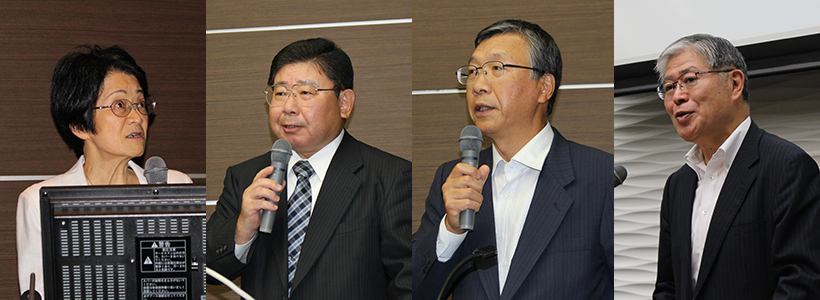 左から、講演を行う稲葉理事・副学長、講演を行う川合氏、司会の澤田事務局長、挨拶を行う横内会長