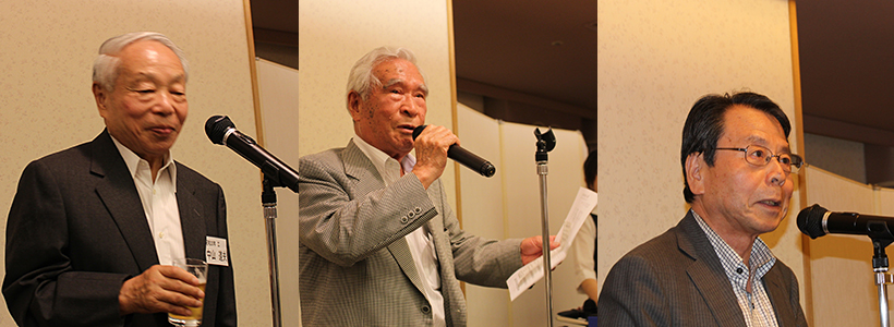 挨拶を行う中山副会長、「琵琶湖周航の歌」をリードする小泉顧問、閉会の挨拶を行う臼井副会長