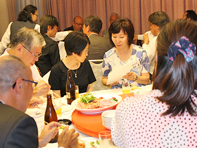 会場を移して行われた懇親会では、中山道夫 副会長(工学部・1958年卒)の乾杯で開宴、女性部会の伊藤絢子 萌黄会事務局長(法学部・2005年卒)および小南貴之 ゴルフ部会長(法学部・1994年卒)からの部会活動報告に続き、初参加の会員による抱負や楽しいスピーチに会場は笑いに包まれ、大いに盛り上がっていました。