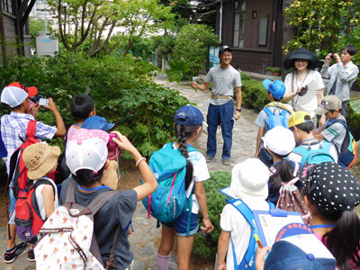 大きなヤツデなど、色々な植物についての説明を聴く子どもたち