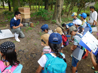 子どもたちは調査ポイントの北白川試験地では大橋健太 フィールド科学教育研究センター技術職員のほか、大学院生による日本ミツバチの説明や蜂蜜の試舐、物理学・宇宙物理学専攻では太田耕司 理学研究科教授から天体望遠鏡の仕組みなどの説明、馬術部厩舎では学生部員による馬に触れる体験、これらを通して研究報告書を完成させました。