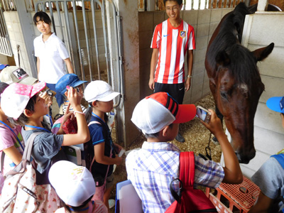 厩舎で馬と触れ合う様子