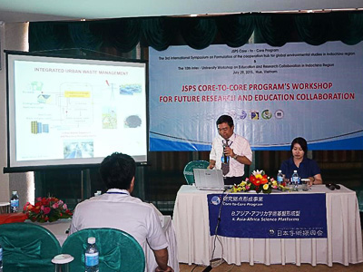 また、29日、日本学術振興会(JSPS)研究拠点形成事業「インドシナ地域における地球環境学連携拠点の形成」のミニワークショップを本会の中で開催しました。ワークショップは藤井学堂長の開会挨拶から始まり、活発で積極的な討論を3部構成で行いました。第1部では本学とインドシナ地域の各大学代表者による大学紹介および国際共同研究活動の紹介が行われました。続いて第2部では共同研究に関して小林広英 地球環境学堂准教授が次回のJSPS研究拠点形成事業に関する提案を発表しました。最後に第3部では田中周平 地球環境学堂准教授が本学と東南アジア諸国連合の大学間での新たな学術共同研究の構想とダブルディグリー・プログラムの計画を報告しました。本ワークショップは本学とベトナムを中心としたインドシナ地域の各大学との間で、研究と教育の点における国際学術共同研究の次のステージについて討論を行う良い機会となりました。