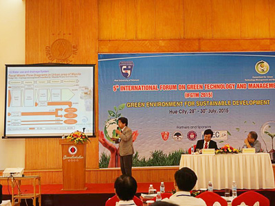 藤井滋穂 地球環境学堂長らが、ベトナムのフエ市内にあるフエグリーンホテルにて開催されたInternational Forum on Green Technology and Management 2015(IFGTM 2015)に参加しました。 IFGTM2015は2011年よりベトナムの上位の大学と嘉南薬理大学(ERM-CNU台湾)を含むConsortium for Green Technology Management and Research(CGTMR)によって毎年行われている環境工学系の研究発表会であり、2015年6月の時点で11の大学がCGTMRに加入しています。今回は7カ国から150名が参加し、学術分野における交流を深めました。本会の中で藤井学堂長は「アジアの都市における水利用の実態比較」について基調講演を行いました。