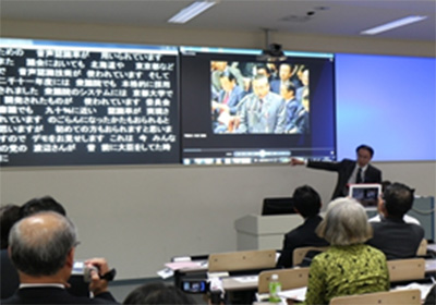 河原達也 情報学研究科教授および秋田祐哉 経済学研究科講師らは、自然な話し言葉を対象とした音声認識の研究を行っており、講演・講義に字幕付与を行うシステムを開発しました。講演者には、事前に予稿を提出してもらい、音声認識システムをその話題や語彙に特化させることで精度を高めます。また音声認識は完全でなく、誤りを修正する人員が必要となりますが、精度が高い場合には1名でもできます。パソコン要約筆記者と比べて経費もおおむね10分の1以下で済むと期待されます。