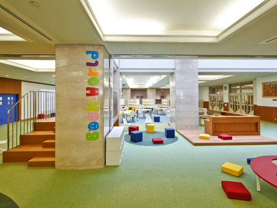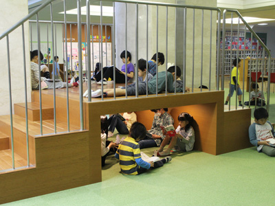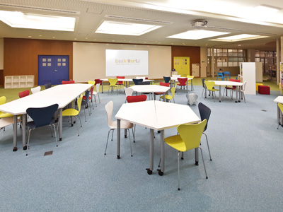 2013年6月にブックワールドの改修計画が門内研究室に持ち込まれ、6年生全員93人と協働するデザインプロジェクトがスタートしました。新しいコンセプトは、ブックワールドを「静かに本を読む場所」から「○○○○ができる場所」へと変換することであり、8月~11月に4回ワークショップを開催しました。子どもたちは9つの班に分かれて自由にアイデアを出し合い、それをもとに門内研究室が「未来・宇宙」「暮らし・住まい」「自然・原っぱ」という3つの物語世界に対応する巨大模型を作成し、それに子どもたちがさまざまな意見を出し、最終案が出来上がりました。竣工は2014年3月。完成したブックワールドには、「てんとう虫テーブル」や「ステージトンネル」など、子ども主体のプロセスの成果が散りばめられています。